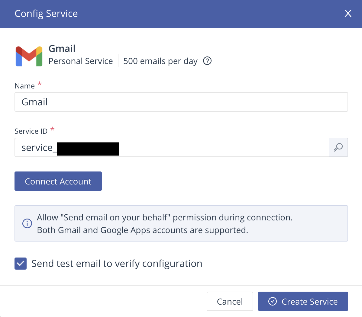 본인이 어떤 서비스 플렛폼으로 이메일을 받을지 선택한뒤 연결하고 CreateService 를 누르면 위 사진처럼 서비스 코드가 생성되는것을 확인할 수 있다.
