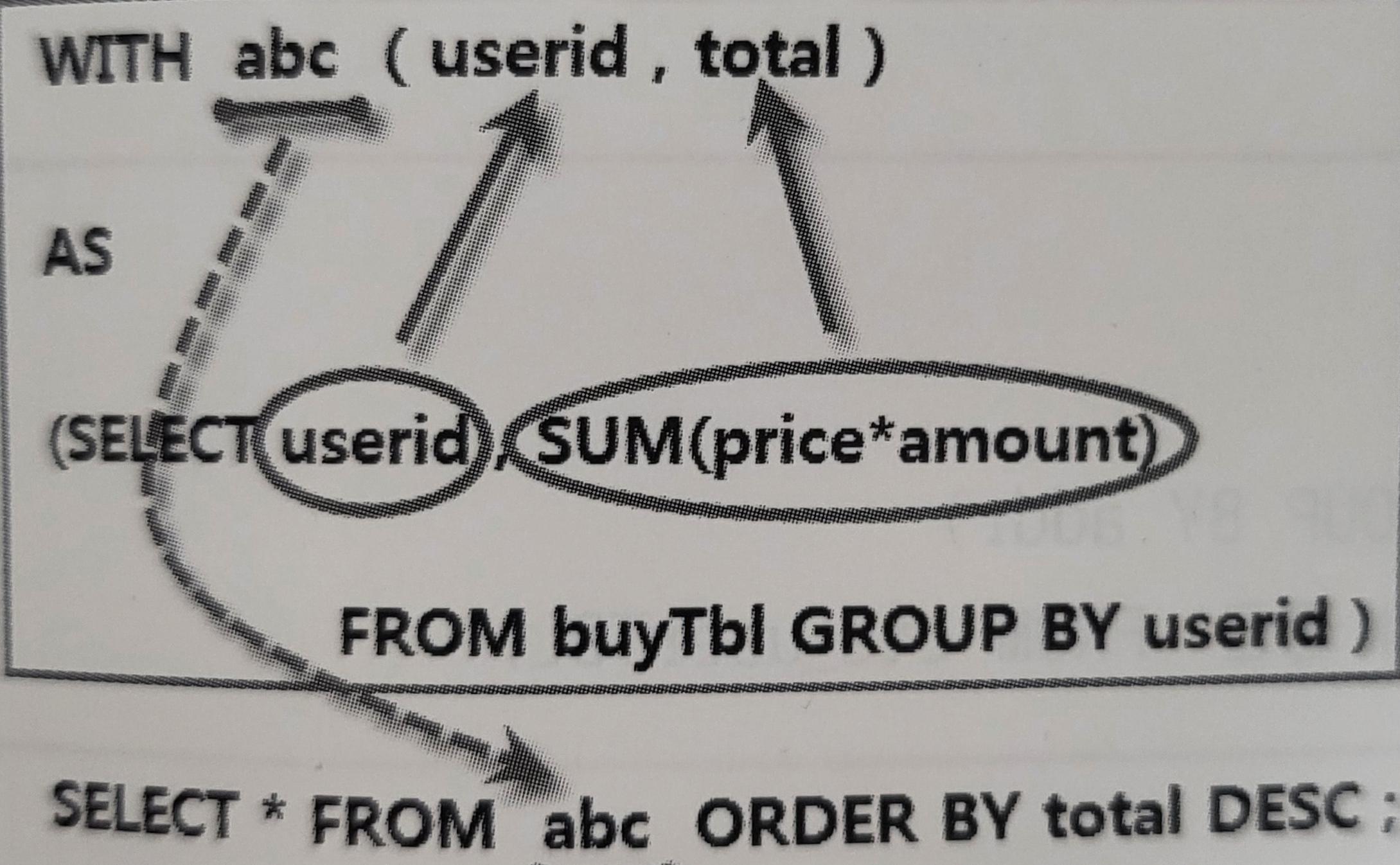 제일 아래의 'FROM abc ' 구문에서 abc는 실존하는 테이블이 아니라, 바로 위에 네모로 표시 된 WITH구문으로 만든 SELECT의 결과다. 단, 여기서 'AS(SELECT ···' 에서 조회하는 열과 'WITH abc(···'과는 개수가 일치해야 한다.