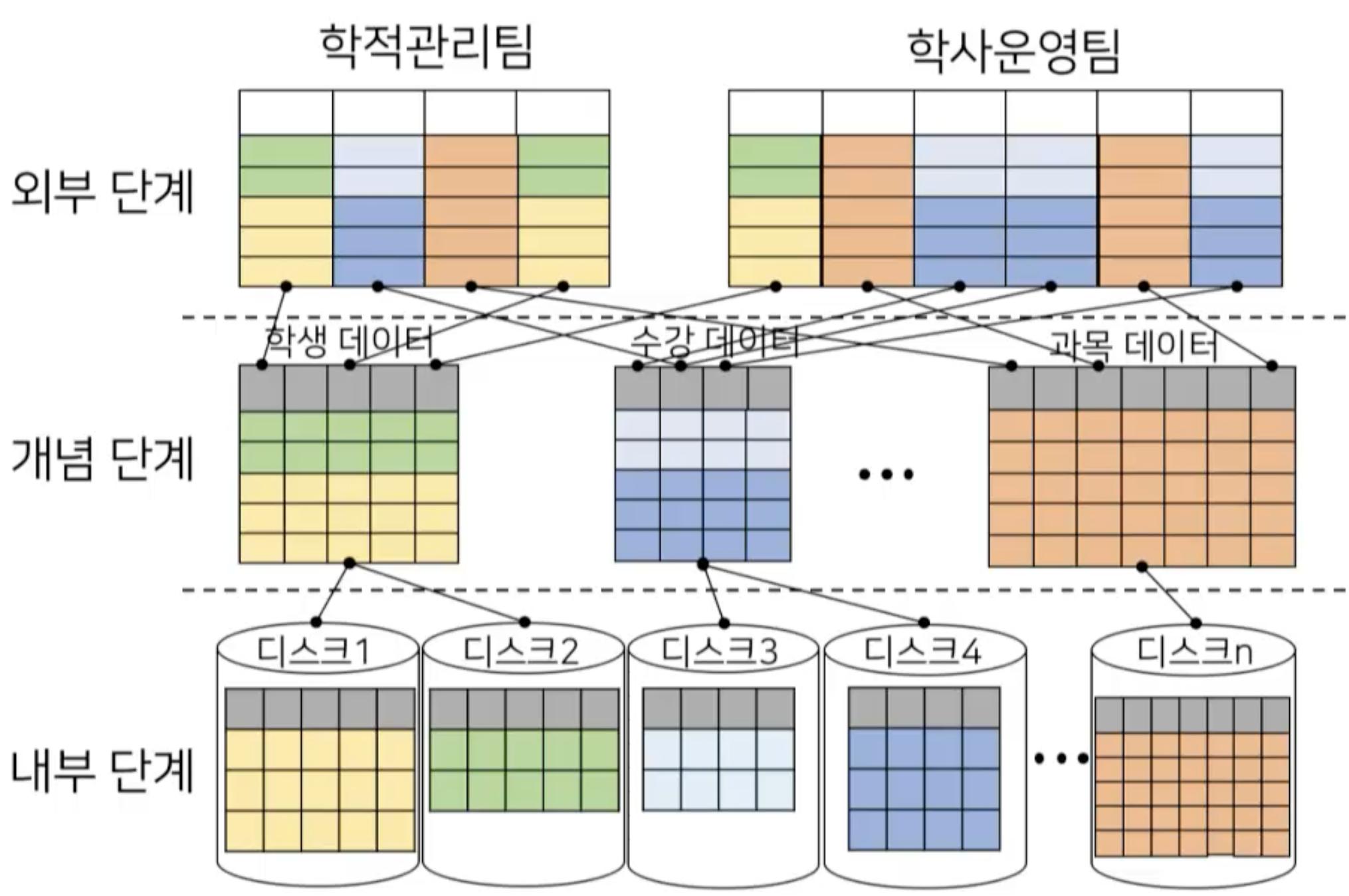 외부데이터 : 실제 사용자가 필요한 데이터를 볼 수 있는 부분만 창을 열어준 것. 일반 사용자는 어느디스크에서 데이터를 가져오는지까지 알 필요 없음.
