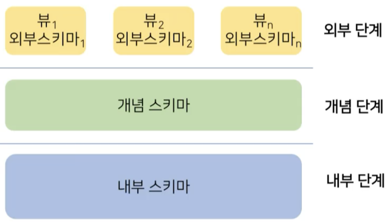 - 데이터베이스 시스템은 3단계 구조, 즉 외부 단계, 개념 단계 그리고 내부 단계로 구성된다. 외부 단계는 사용자 뷰를 나타내며, 개념 단계는 데이터베이스의 논리적인 전체 구조를 나타내고, 내부 단계는 데이터가 기억장소에 저장되기 위한 물리적 구조를 정의한다.