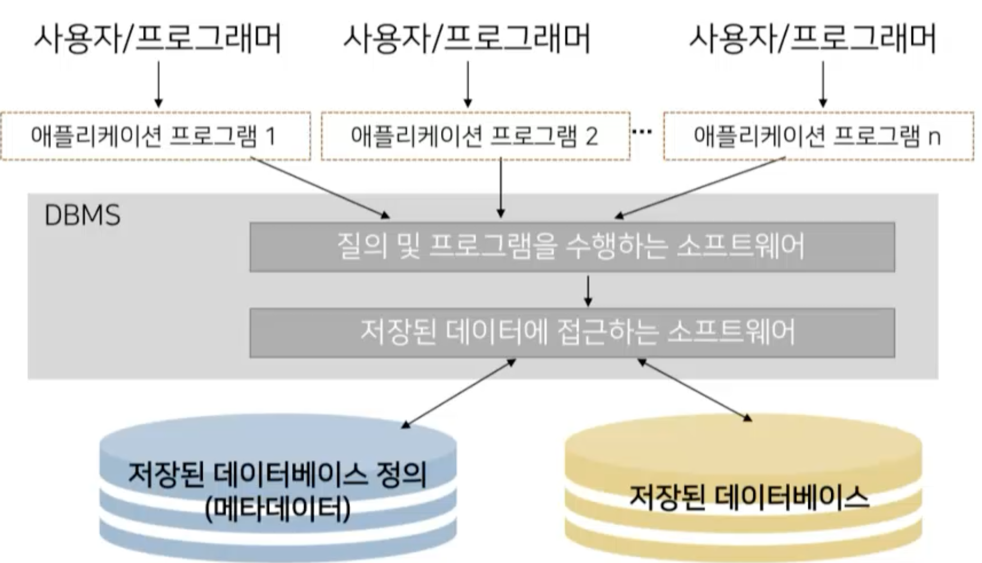 3. 데이터베이스 관리 시스템(DBMS) : 데이터베이스에 저장된 데이터의 구성, 저장, 관리, 사용을 위한 소프트웨어 패키지