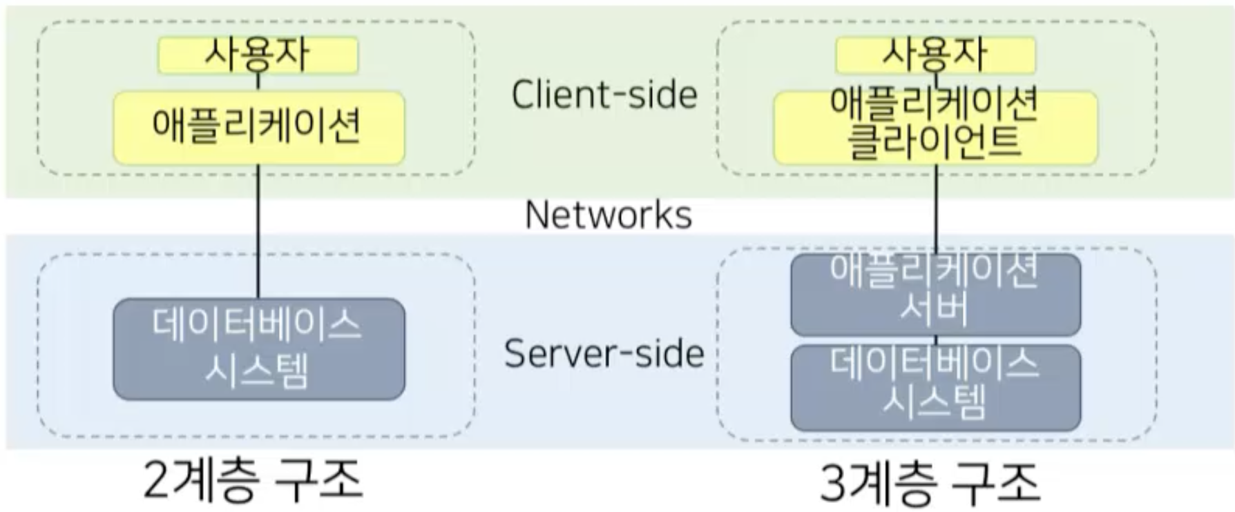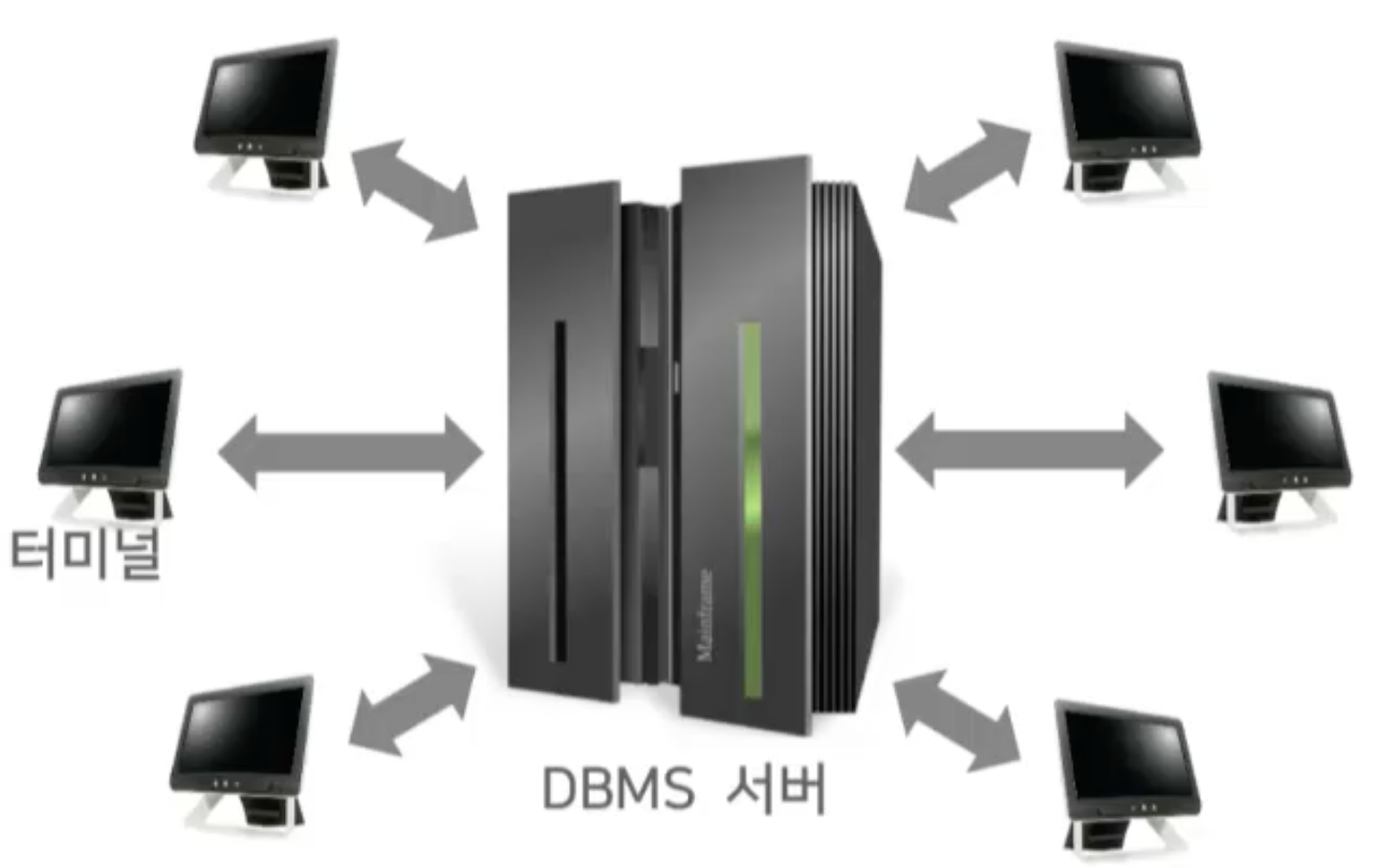 - DBMS는 전체 시스템을 구성하는 방식에 따라 중앙집중식과 분산 시스템 방식으로 아키텍처를 구성할 수 있다.